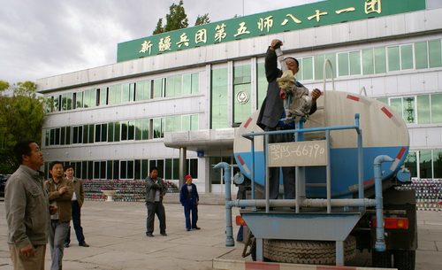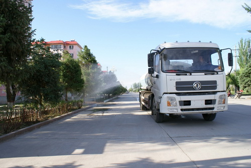 5月22日早晨,新疆兵團第五師八十一團迎賓路上看到,由湖北隨州市汽車改裝廠-湖北江南專用特種汽車有限公司對口支援團場捐贈的一輛東風天錦灑水車正在為道路兩旁新植的灌木林澆水,這也是八十一團建團以來第一輛正規的灑水車,此次隨州向八十一團捐贈的還有一輛消防車,這是隨州市項目和資金援疆的又一成果。