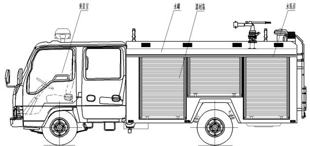 總體布置 | 整車由消防員乘員室和車身兩大部分組成,車身布置采用整體框架式結構,內藏水罐,兩邊為器材箱,后部為水泵房,罐體為平行長方體廂式容罐。 |