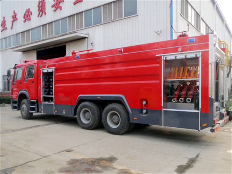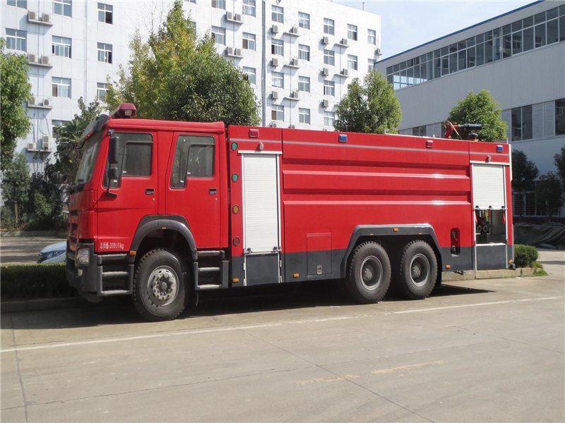 JDF5314GXFPM160型泡沫消防車,采用重汽豪沃ZZ5347V4647E1底盤改裝而成。整車由消防員乘員室和車身兩大部分組成,乘員室為單排改雙排,可乘坐2+4人,該車為外露罐結構,車身前部為器材箱,中部為水罐,后部為泵房。載液罐體為優質碳鋼,與底盤采用彈性連接,載水12780kg,泡沫液量2770kg,裝備了上海雄真消防設備有限公司生產CB10/60型中低壓消防泵,額定流量60L/S,車頂安裝成都威斯特消防機械有限公司生產的PL48型車用消防炮。該車最大的特點是載液量大、操控性好、維修簡便。可廣泛應用于公安消防隊、廠礦企業及社區、碼頭等場所,撲救大型油類火災或一般物質火災。