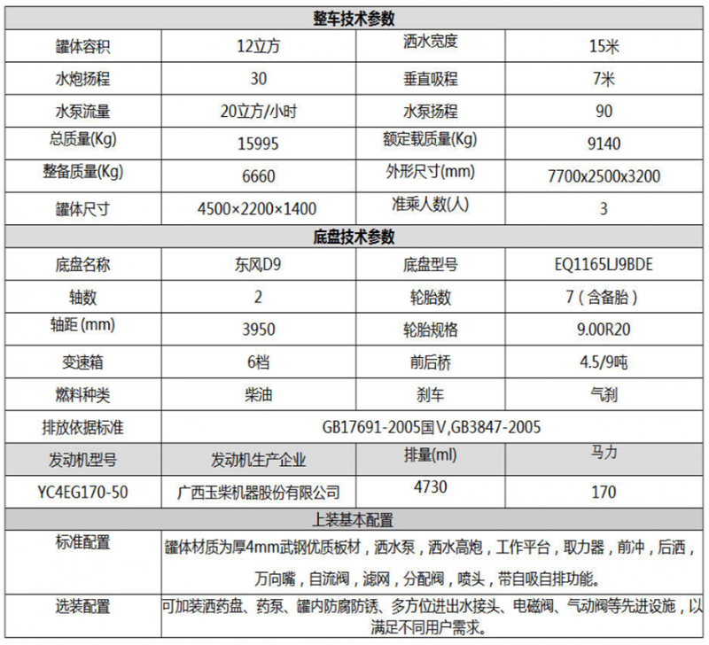 東風(fēng)D9 12噸綠化灑水車底盤配置:采用東風(fēng)原裝底盤,多利卡D9系列,駕寬2315,排半,軸距3950mm,發(fā)動(dòng)機(jī)ISB180 50、YC4EG170-50,東風(fēng)6檔變速箱,9.00R20輪胎,動(dòng)轉(zhuǎn),氣制動(dòng),中控,電動(dòng)門窗,+ABS。