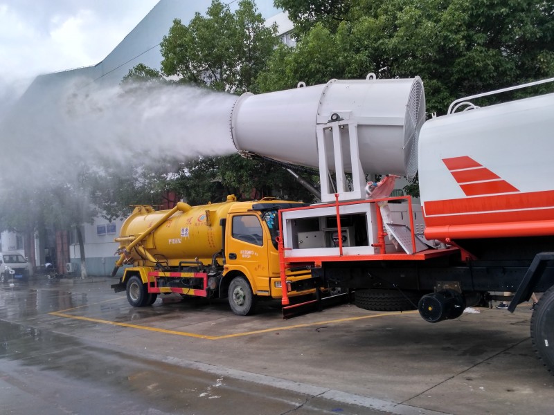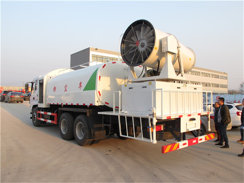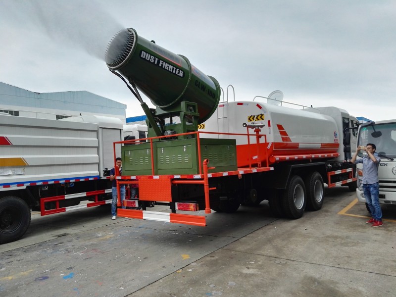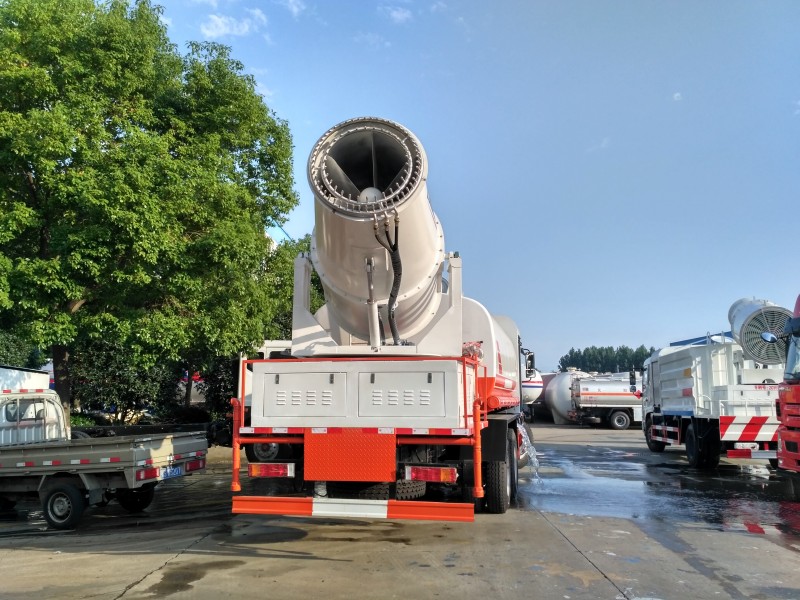 東風隨專16噸抑塵車上裝分為霧炮、機組、水罐罐體三大部分,依靠環保霧炮上高速運轉的風機風送原理,把罐體內的水經霧化風送到30--120米遠的射程,霧炮車噴射的水霧顆粒極為細小,達到微米級,在霧霾天氣可以進行液霧降塵、分解淡化空氣中的顆粒濃度、能有效分解空氣中的污染顆粒物、塵埃等,將漂浮在空氣中的污染顆粒物迅速逼降地面,達到清潔凈化空氣的效果。