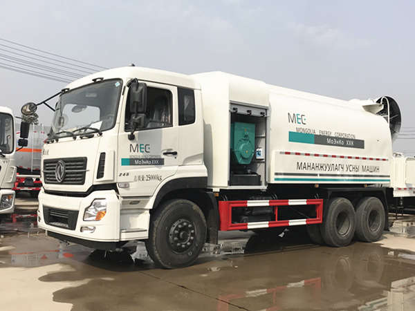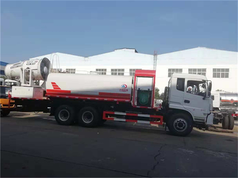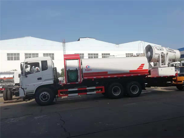 2. 東風16方抑塵車工作效率高、噴霧速度快;對容易引起塵埃的堆場噴水除塵時,噴出的霧粒細小、與飄起的塵埃接觸時,形成一種潮濕霧狀體,能快速將塵埃抑制降沉,霧量沉降率可達95%。