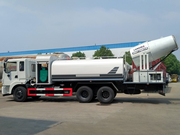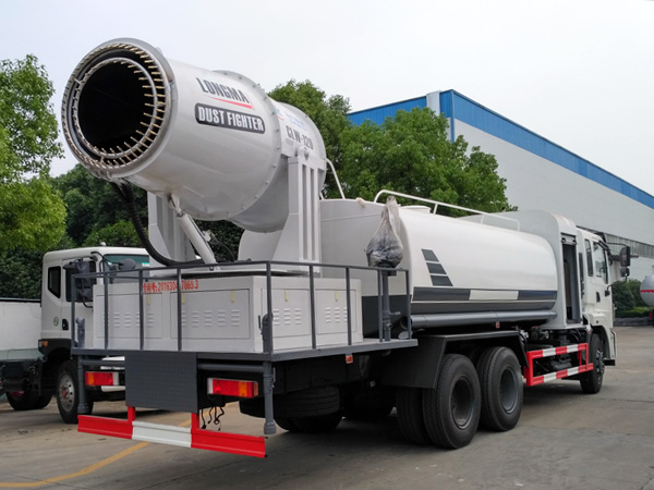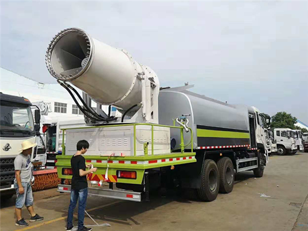 東風天龍16方抑塵車上裝分為霧炮、機組、水罐罐體三大部分,依靠環保霧炮上高速運轉的風機風送原理,把罐體內的水經霧化風送到30--120米遠的射程,霧炮車噴射的水霧顆粒極為細小,達到微米級,在霧霾天氣可以進行液霧降塵、分解淡化空氣中的顆粒濃度、能有效分解空氣中的污染顆粒物、塵埃等,將漂浮在空氣中的污染顆粒物迅速逼降地面,達到清潔凈化空氣的效果。